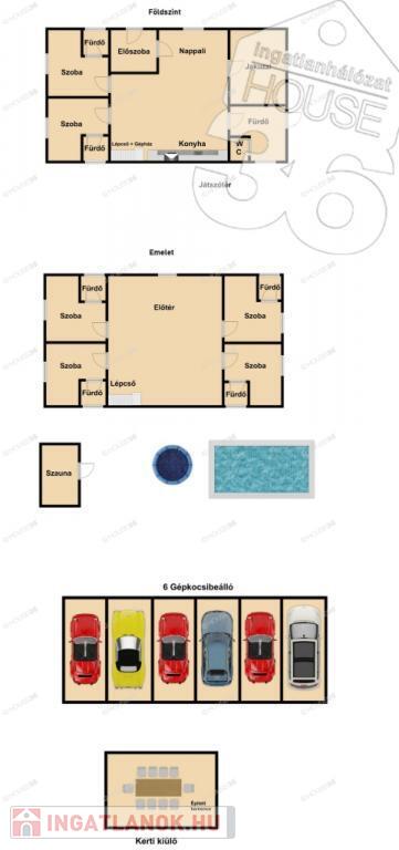 - 6 fürdőszoba (2 kádas, 4 zuhanyzós) + 1 mosdó külön wc-vel