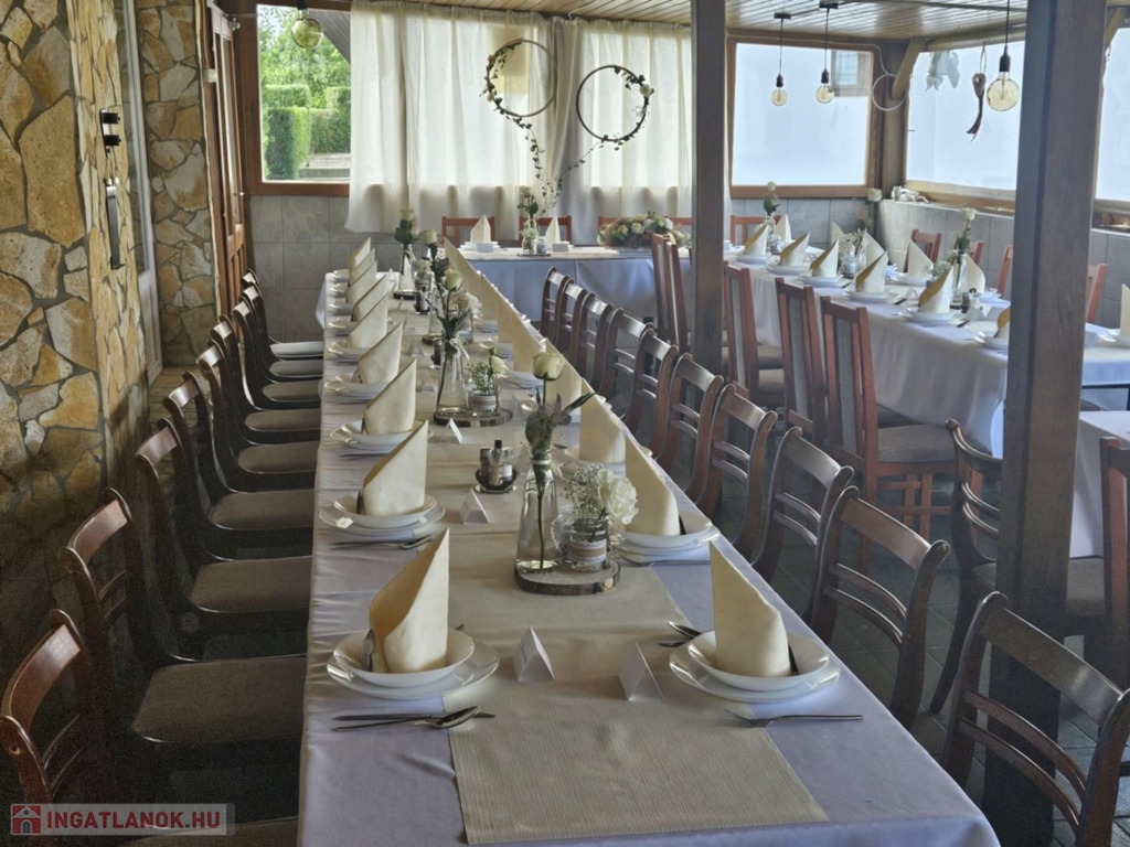 - az alsó szinten, ( 98 m2 ) jelenleg a vendégtér, konyha, előkészítők , mosdók és egy nagy terem van kialakítva ( ami egybenyitható a fedett és zárt terasszal )