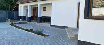 Az első udvar részben térkövezett, van kocsibeálló, garázs, pince.