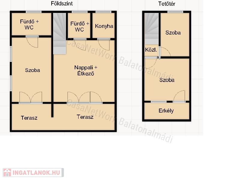- külön bejáratú nagyobb része tetőtér beépítéses,  2+1 szobából, konyhából, fürdőszobából áll, másik része teljesen elszeparálva 1 szoba+fürdőszoba.