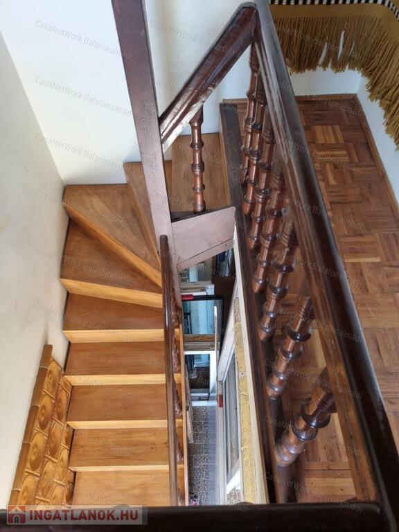 - a földszint: nagy terasz, konyha-étkező, fürdőszoba és egy szoba; az emeletre belső lépcső vezet, itt egy közlekedőt, egy hálószobát, egy fürdőszobát és egy erkélyt találunk; szép balatoni panorámával