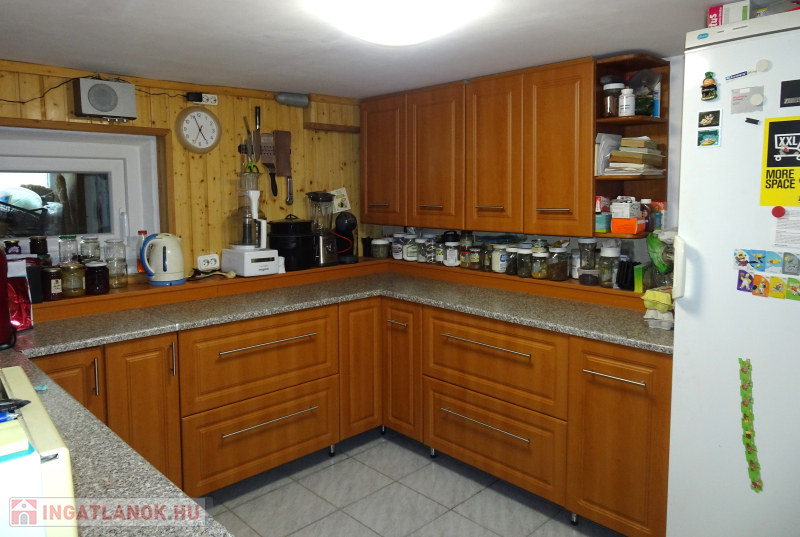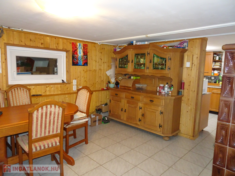- az alsó, szuterén szinten: konyha, étkező, kamra és egy gépészeti- és háztartási helyiség (WC-vel), valamint egy külön bejáratú tároló