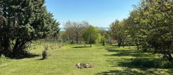 Téglalap alakú, hangulatos, bekerítettlen, enyhén lejtős 3298 m2-es telek tartozik hozzá, melyet gyümölcsfák (6 cseresznyefa, meggyfa, fügefa), csemege szőlő, valamint mandula, nyírfa, feketefenyő, illetve boróka tesz még színesebbé, kellemes intimitást biztosítva minden oldalról a ház tulajdonosának.