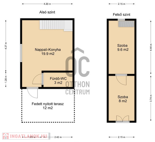 Az ingatlan alapterülete 40 négyzetméter, az alsó szinten nappali-konyha, fürdőszoba-WC, az emeleten két hálószoba található,