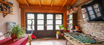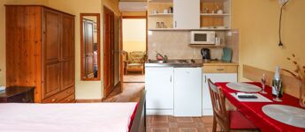 Az ingatlan másik része vályogtégla falazatú, melynek aláfalazása, szigetelése és betonozása 2004-ben szintén megtörtént. Ebben az épületrészben található egy jelenleg is bérbe adott üzlethelyiség, egy iroda, egy nagy méretű tároló, illetve a háztartási helyiség, valamint az infra szauna. Ebben az épületrészben igény szerint egy teljes lakórész is kialakítható az apartmanház üzemeltetői számára, hiszen fürdőszobával és konyhával is felszerelt.