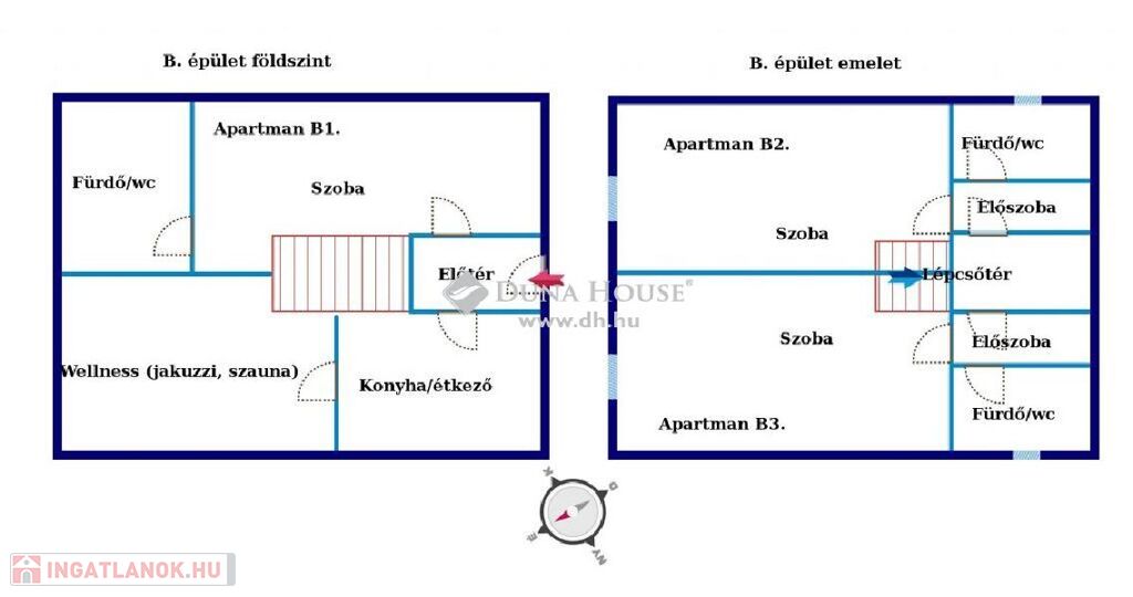 Mindkét házban 3 egy szobás apartman saját fürdőszobával, egy a földszinten, kettő-kettő az emeleten. Az egyik házba wellness helyiség (jakuzzi, szauna), míg a másikban társalgó került kialakítása a konyha mellett.