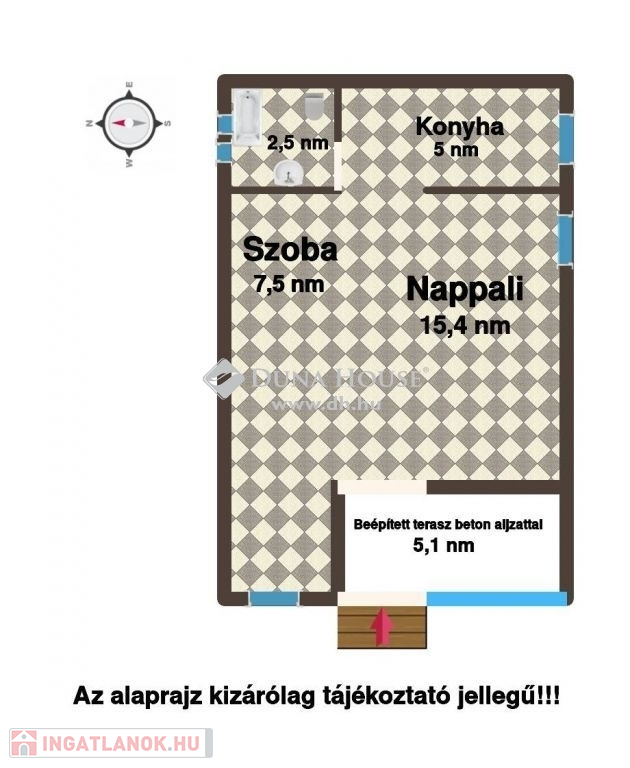 A beépített üvegezett teraszról lépünk be az egyterű nappali, szobába. Mindössze egy fallal van leválasztva a konyha helyiség.Találunk még egy kis fürdőt, káddal, toalettel.