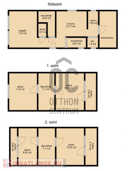 - 1-2 szint: 2-2 szoba helyiségekből áll.