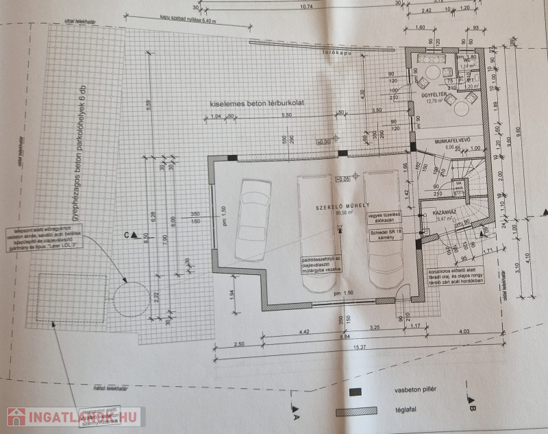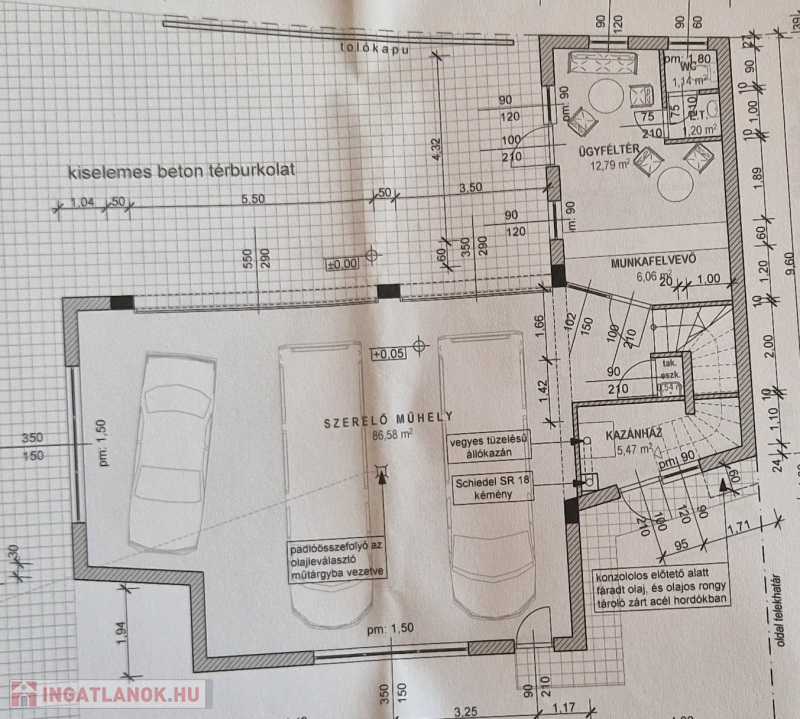 18. kerület forgalmas részén 224 m2-es, kétszintes, 3 állásos (2 emelős, 1 aknás) autószerviz, irodákkal, fürdőszobákkal, öltözővel, étkezővel, raktár helyiségekkel eladó. A 480 m2-es telken a műhelyen kívül még kb. 10 db. személygépkocsi fér el. Övezet: GKSZ2. Az emeleti étkező egy részéből iroda került kialakításra.