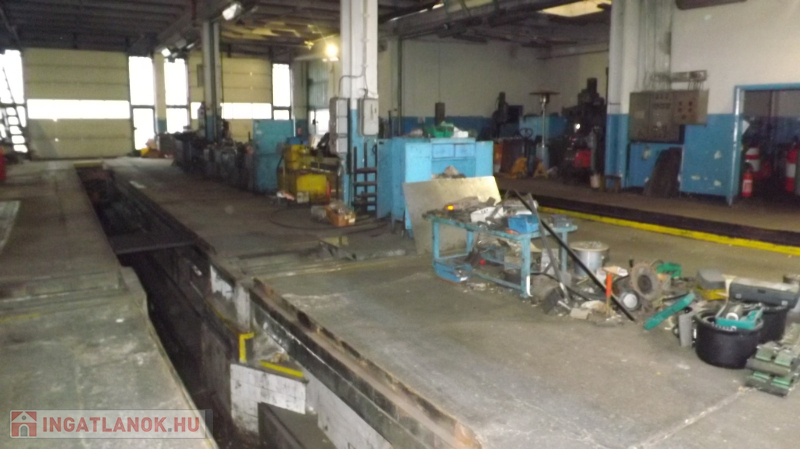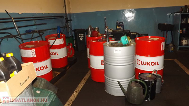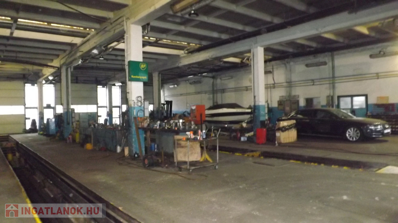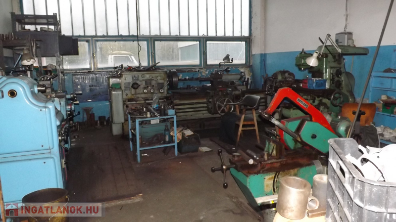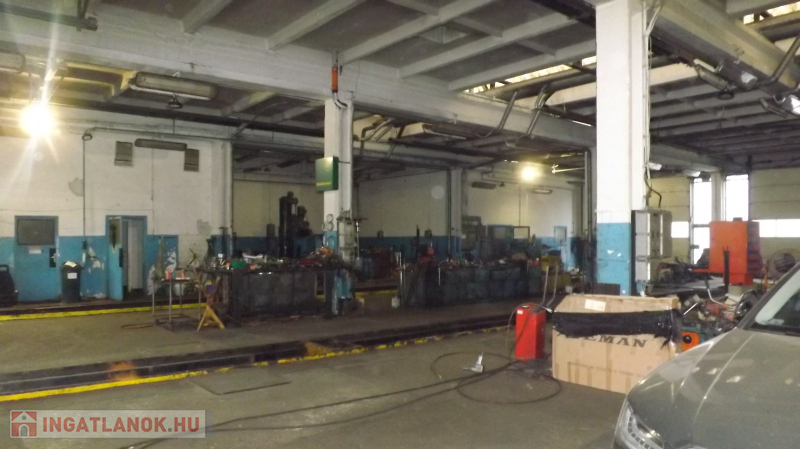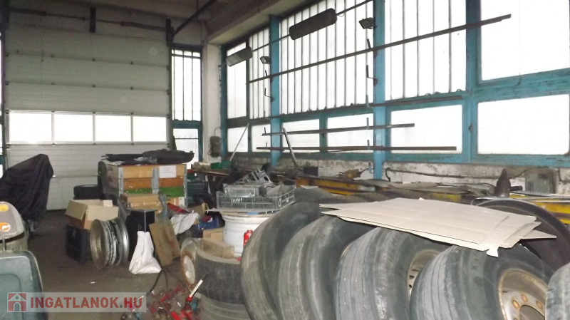 A műhelyben: 4,5m a belvilág, 38 m hosszú, tehergépjárművek javítására kialakított 3,5 beállás található, ebből 2 akna, fékpad, emelők, esztergályos és lakatos műhely kialakítva, raktárak, mosdó, wc, Scandoor kapuk , gáz sötétsugárzó fűtés.