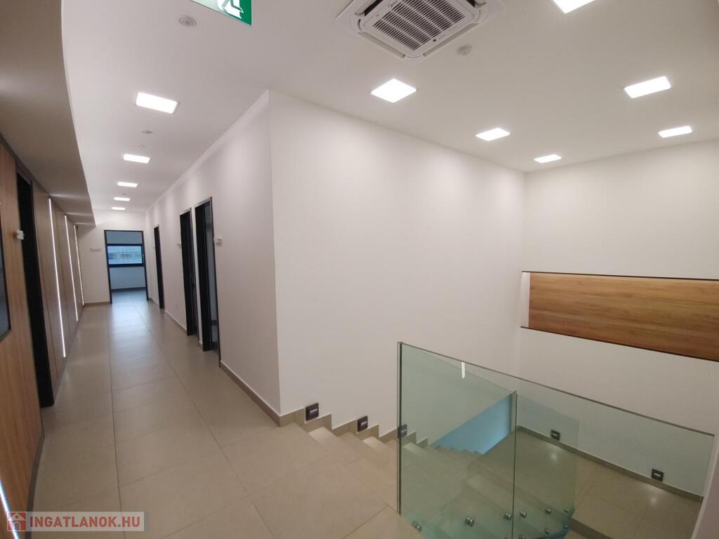 Az emeleti szint további 224 nm nettó alapterületű, amelynek számos szobájából a Gerecse hegység látható. Letisztult, modern formák, automatikus LED világítás, igazgatói iroda, tárgyaló, hatalmas konyha-étkező, mellékhelyiségek és további irodák, irattár stb.