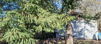 A telek zöld, a növényzet természetes, valamint van rajta egy barátságos kis ház, tárolóval.