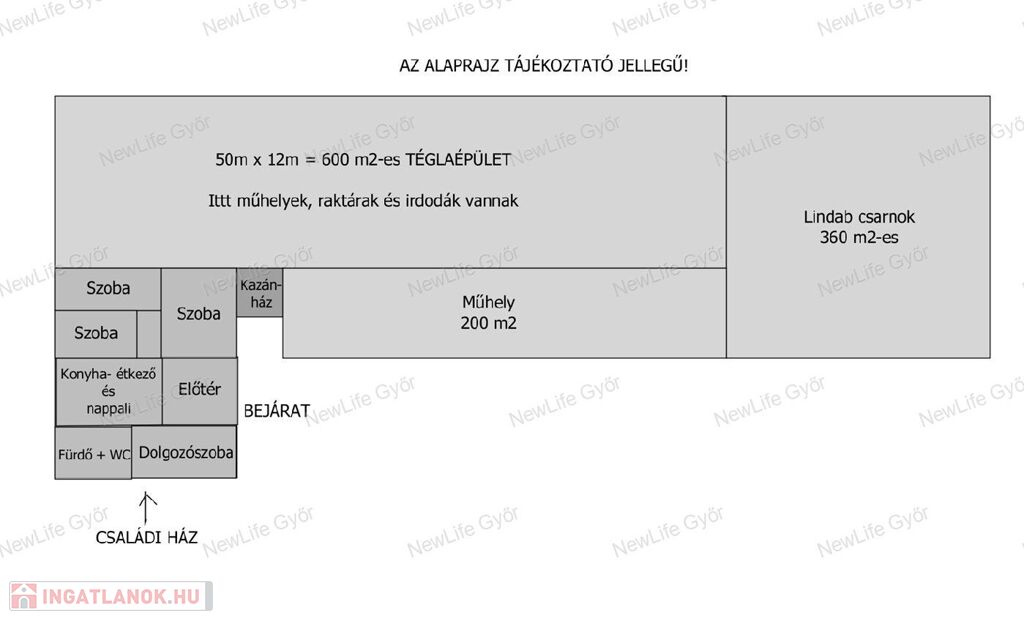 - 50×12 m-es tégla raktár (iroda, konyha, ipari áram, gázcsonk, felszerelt radiátorok)