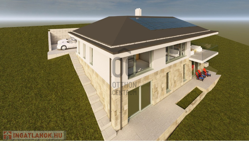 A háztervek kétszintes családi házról szólnak, amerikai konyha nappalival, nagy panorámás terasz kapcsolattal, alsó szint tárolókkal, terasszal építhető meg.
