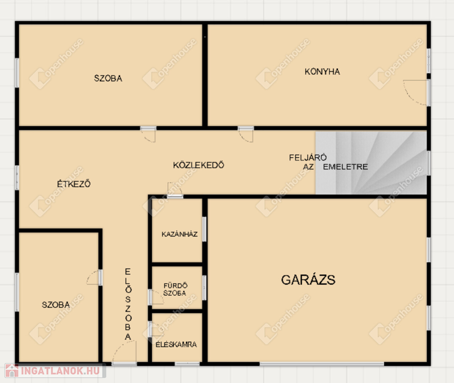 - alsó szinten: két bejárat biztosított az udvar felől melyek egyike az előszobába, a másik pedig a konyhába nyílik - előszoba, kamra, fürdőszoba, étkező, konyha, kazánház illetve két külön nyíló félszoba