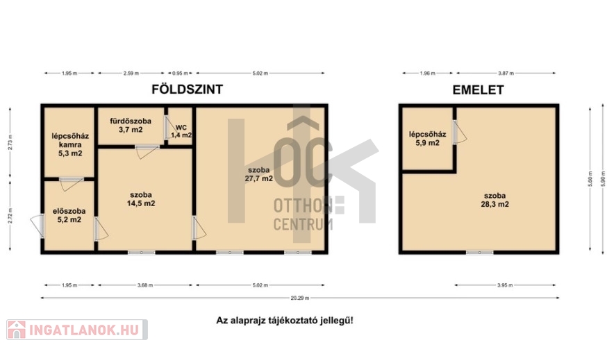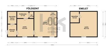 -földszinten: 1 szoba (27,7 m2), konyha fürdőszoba, WC, előszoba, lépcsőház,kamra