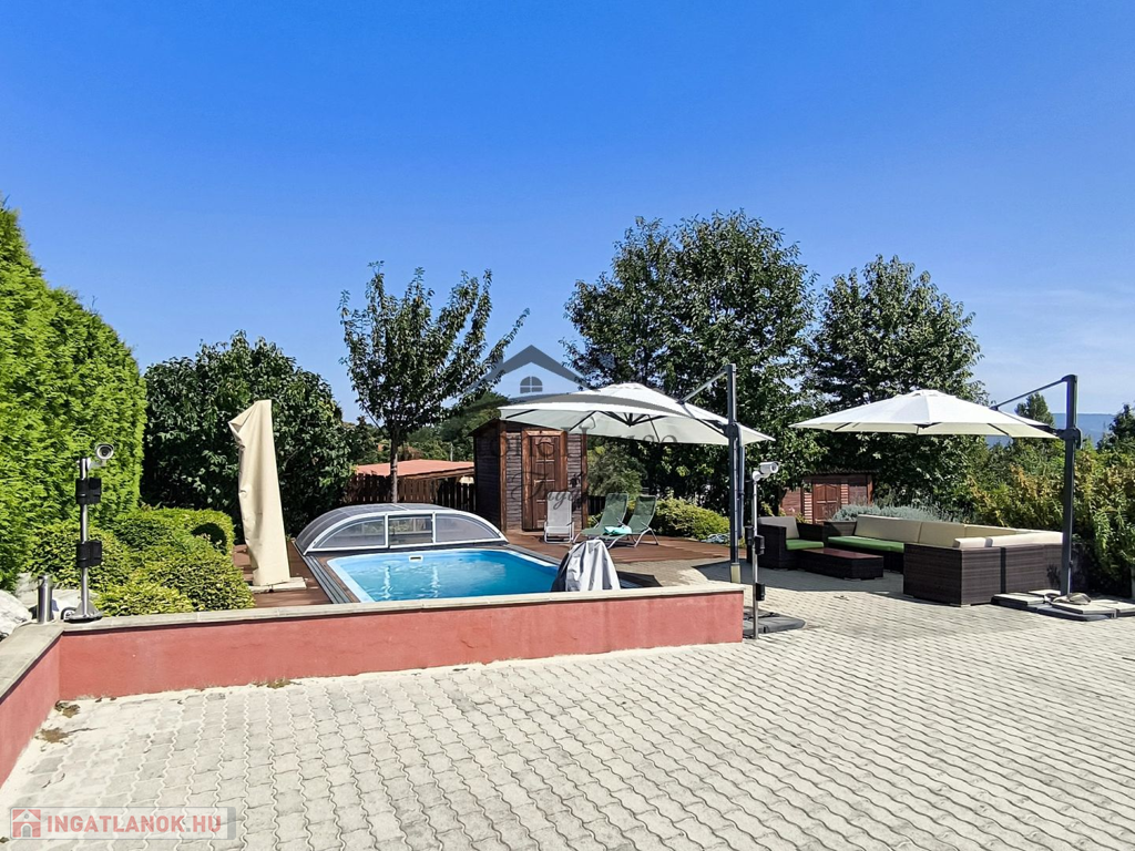 A gyönyörű panorámával rendelkező ház egy parkosított, 2406 m2-es telken helyezkedik el.