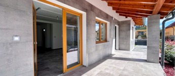 A nagy, fedett teraszra a bejáraton kívül a nappali nagy, elhúzható, üveges teraszajtaján is ki lehet jutni, így az nyári időszakban az élettér szerves része lehet.