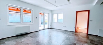A nagy, fedett teraszra a bejáraton kívül a nappali nagy, elhúzható, üveges teraszajtaján is ki lehet jutni, így az nyári időszakban az élettér szerves része lehet.