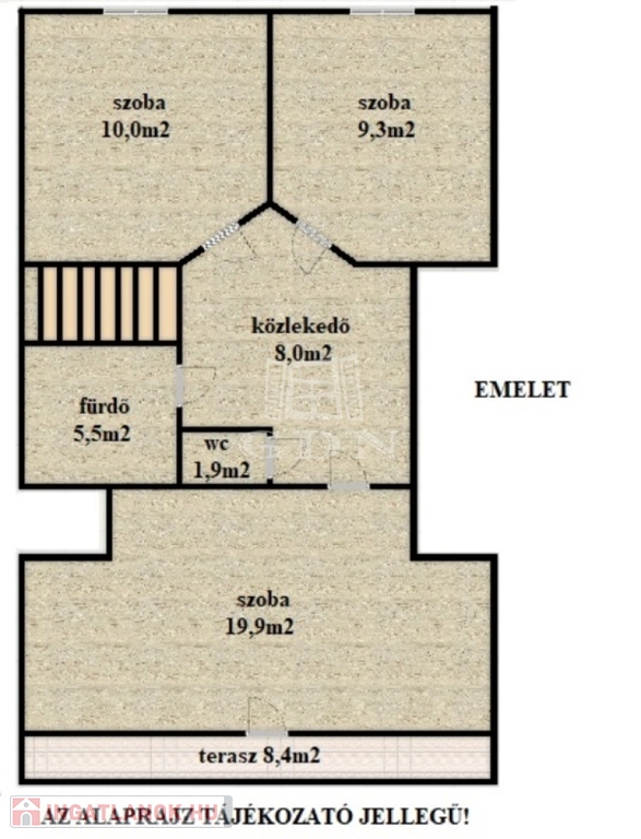 EMELET: szoba (10m2), szoba (9m2), szoba (20m2), fürdő, wc, terasz (8m2)