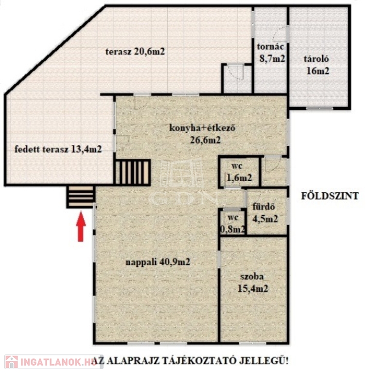 FÖLDSZINT: nappali (41m2), konyha+étkező (27m2), szoba (15m2), fürdő, 2db wc, studio appartmann, terasz (42m2)