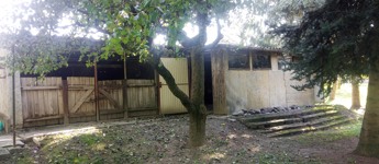 Udvar: A sok szép fán kívül egy 60 m2 –s „kerti tárolót” takar.
