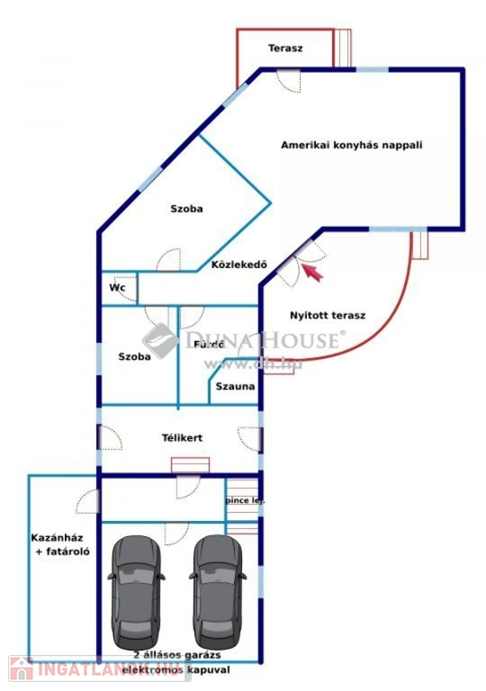 A közel 20 négyzetméteres nyitott teraszról léphetünk be az ingatlanba, ahol egy 50 négyzetméteres amerikai konyhás nappali fogad minket, középpontjában egy kandallóval.