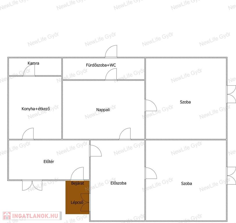 Elosztását tekintve előtérből, konyha+étkezőből, kamrából, előszobából, nappaliból, 2 hálószobából és fürdőszobából áll.