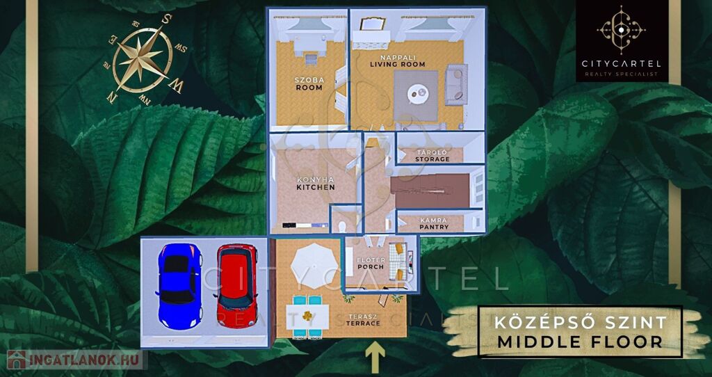 Középső szint: előtér, konyha, kamra, közlekedő, gardrób, vendég-WC, szoba, nagy nappali, terasz