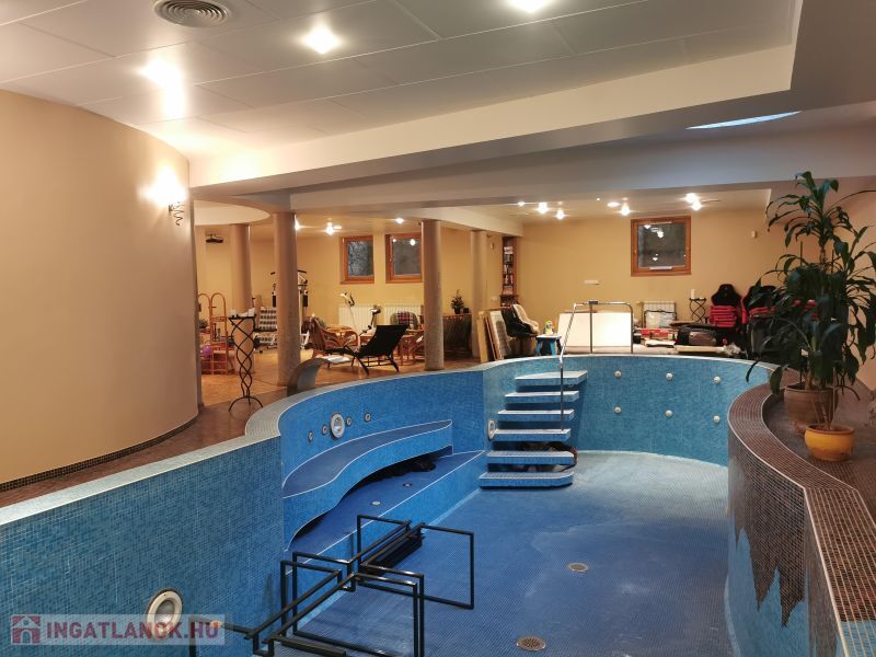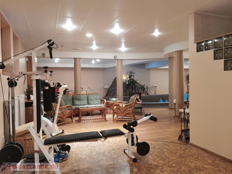 * Alsó szint 260 m2: garázs, wellnesz rész: nagy méretű belső medence, finn és infraszauna, merülő dézsa, fitneszrész, társalgórész