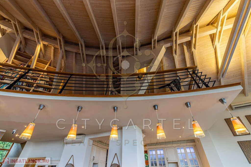 Galériás könyvtár / konditerem / társalgó, 2 hálószoba franciaerkéllyel és gardróbbal, nagyméretű fürdőszoba, tároló
