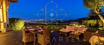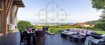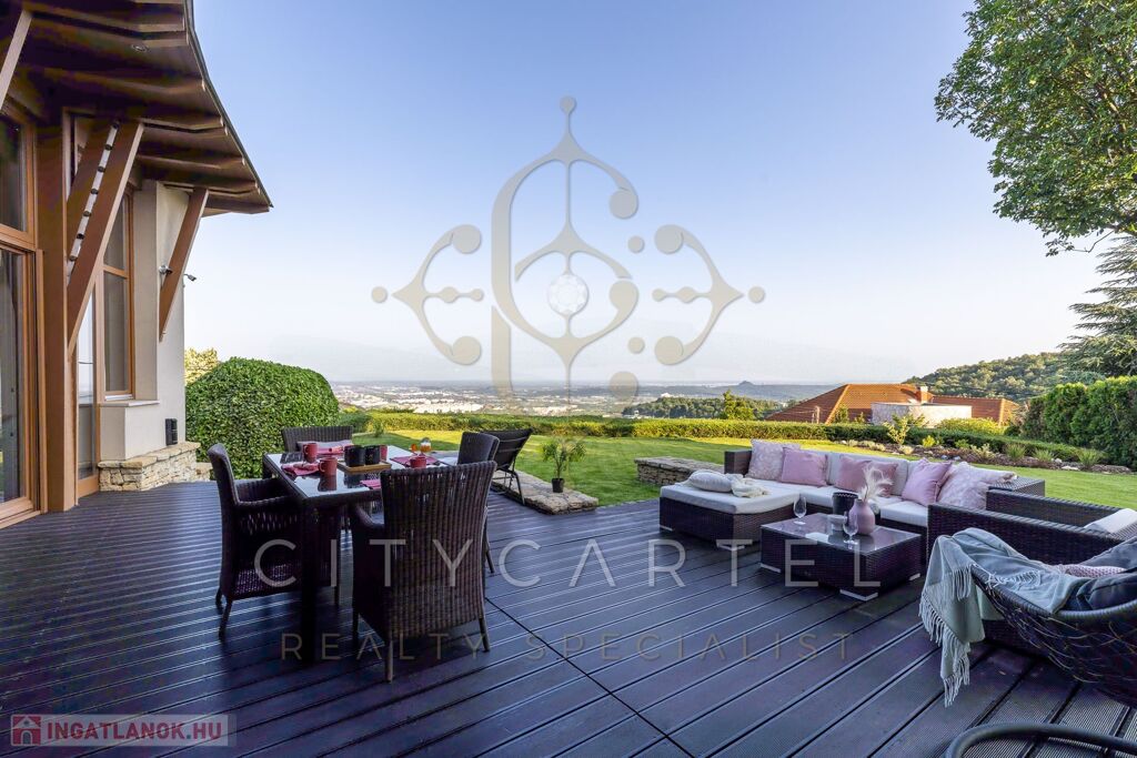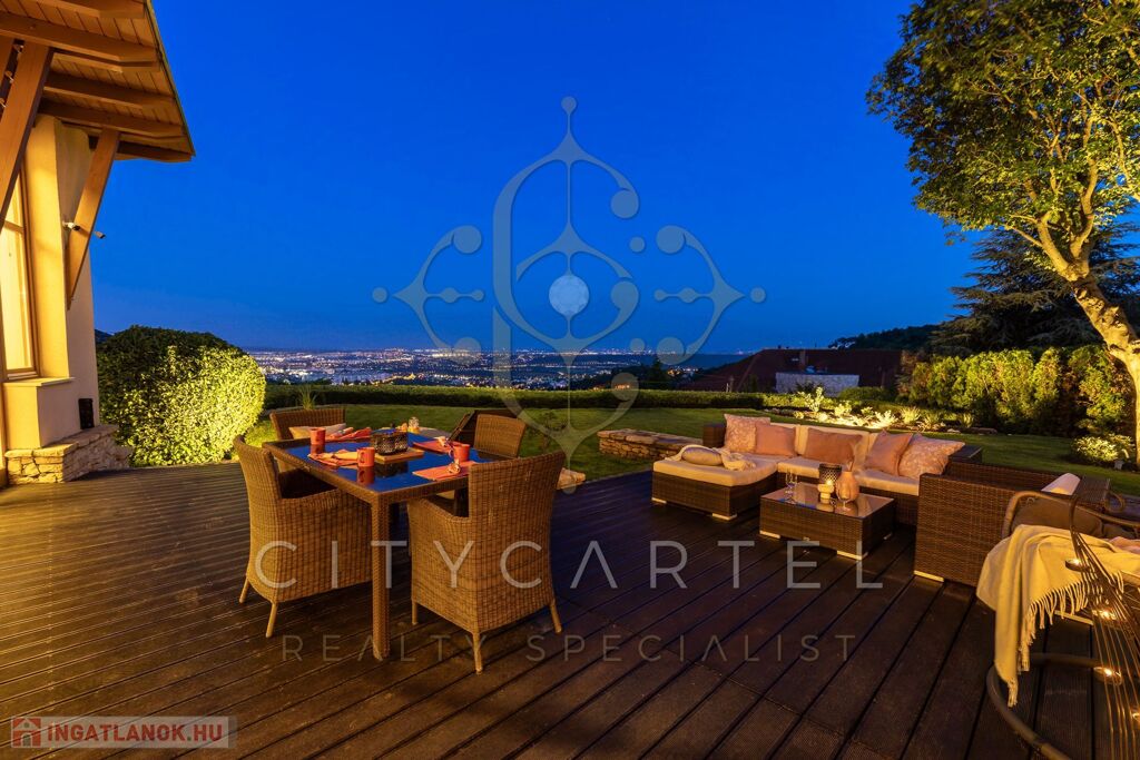 Panorámás, 50 nm-es kertkapcsolatos terasz – városi nappali és esti fényben úszó lenyűgöző látványával és erdei kilátással