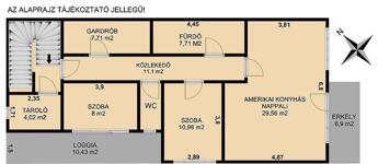 A 83 m2 emeleti lakás részei: közlekedő, amerikai konyhás nappali erkéllyel, 2 hálószoba, gardrób, fürdőszoba, wc, tároló, tágas loggia.