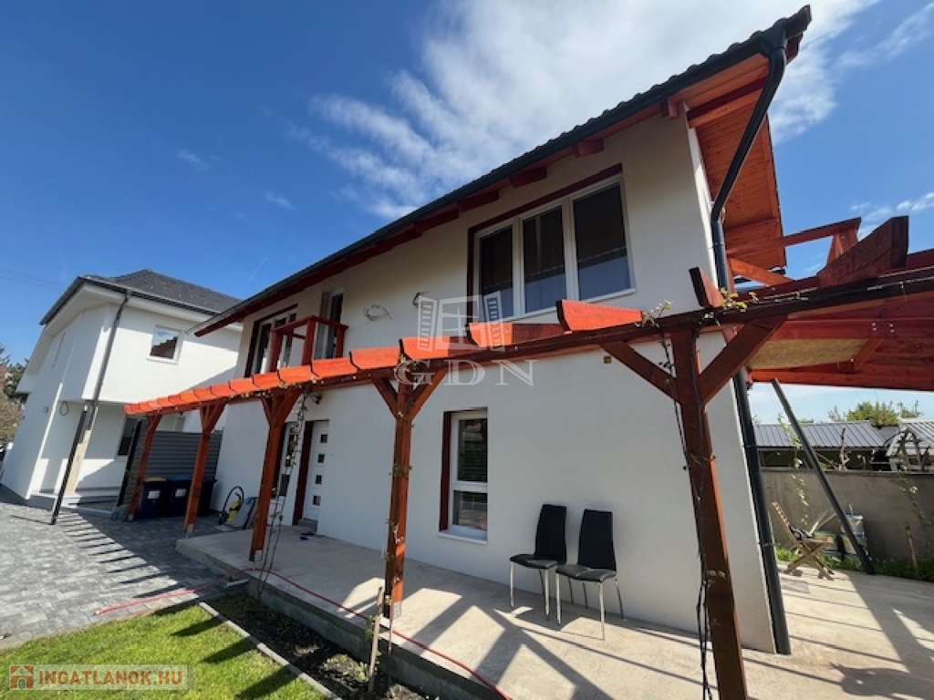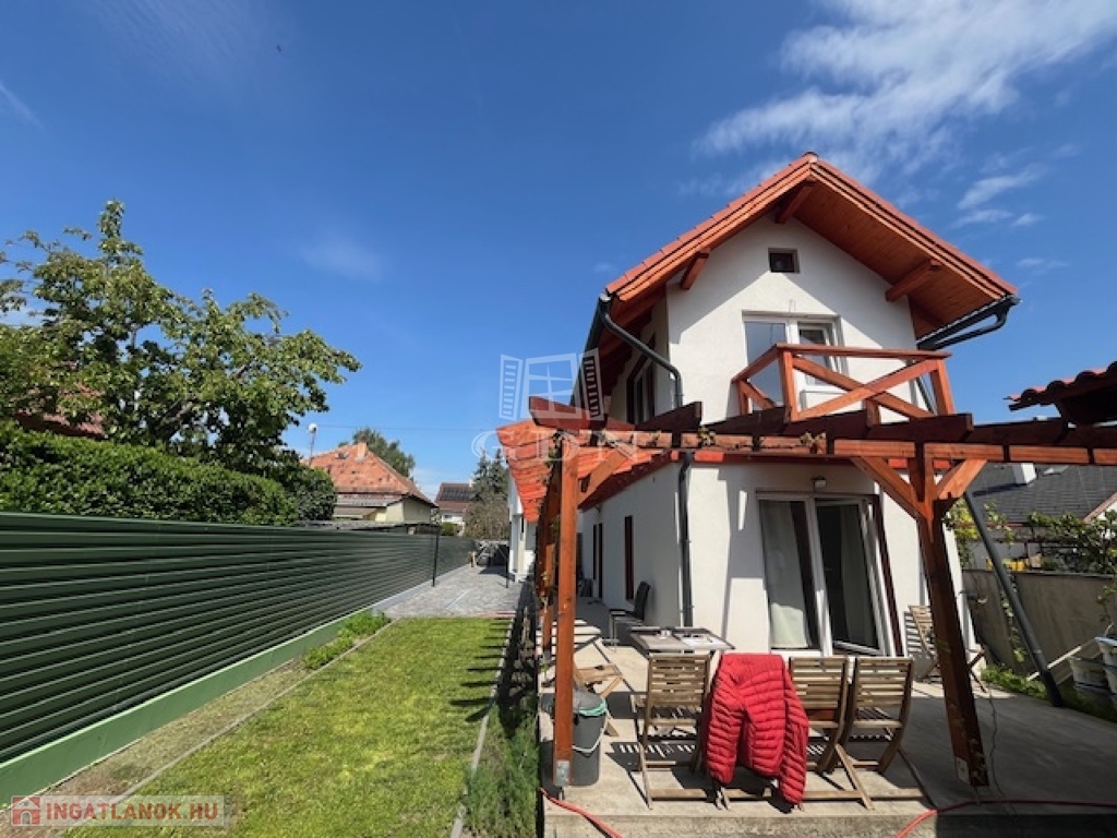 Az ingatlan modern kialakítású, és kiválóan illeszkedik a környezet kertvárosi jellegéhez.
