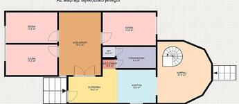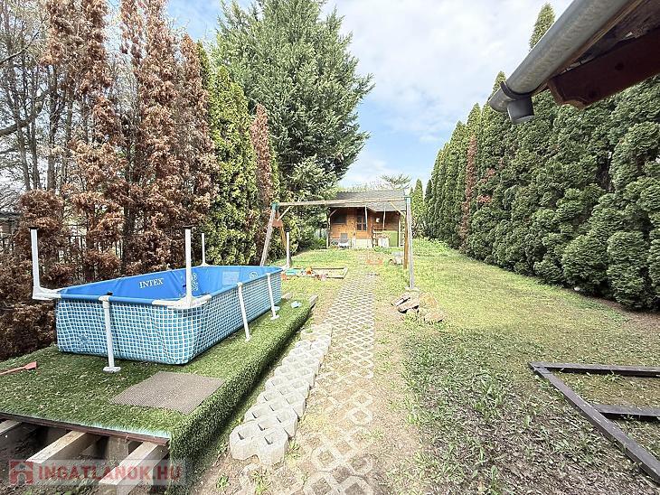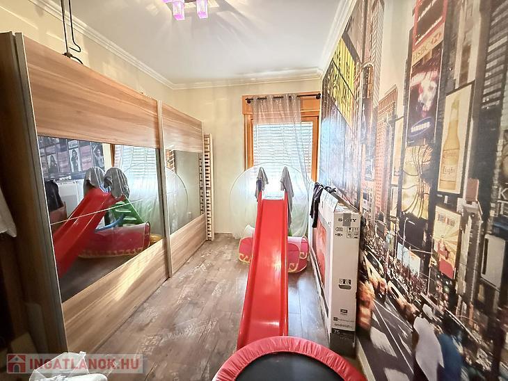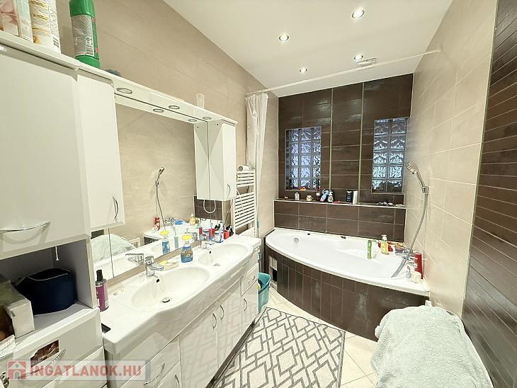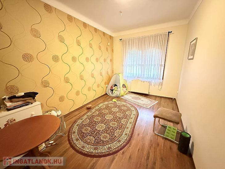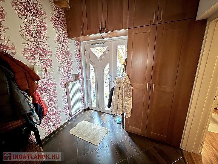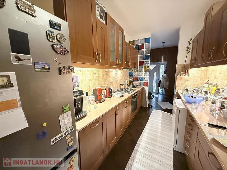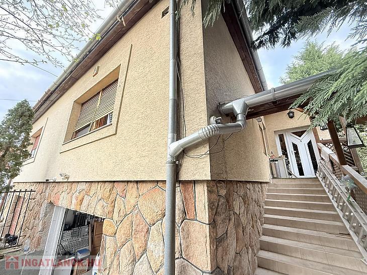 A földszint alapterülete 100 m², míg a szuterén további 80 m²-t biztosít, a telek mérete pedig 612 m². Az ingatlan elrendezése praktikus: három szoba, egy hall, konyha és egy nappali található benne, emellett fürdőszoba, mosókonyha és lépcsőház is rendelkezésre áll. A ház cseréptetővel fedett, elektromos hálózata rézvezetékes, 3×16 amperes teljesítménnyel. A fűtést egy Bosch kondenzációs kazán biztosítja, amely szívó–fújó rendszerű (zárt égésterű), így korszerű és energiatakarékos megoldást nyújt. A két konyhának köszönhetően rezsicsökkentett kedvezmény vehető igénybe, a földszinti konyha pedig gépesített, gáztűzhellyel, elektromos sütővel és mosogatógéppel felszerelt. A burkolatok tekintetében a szobák laminált parkettások, míg a többi helyiség kőburkolatot kapott. A nyílászárók részben fából készültek, részben műanyag, hőszigetelt üvegezéssel ellátottak. A nappaliban padlófűtés biztosítja a komfortot, a homlokzat pedig 5 cm-es hungarocell szigeteléssel rendelkezik.