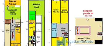 Az ikerházfél 195 m2-es + 2 db 13 m2-es terasz és külön KERT tartozik hozzá.