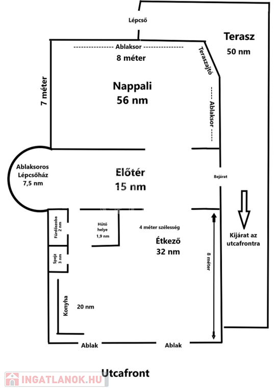 Földszint 144 m2 nappalival 56 m2 , nagy étkezővel és konyhával 52 m2 , minden szinten fürdőszobával . ,fürdőszoba ,spejz ,közlekedő és lépcsőház
