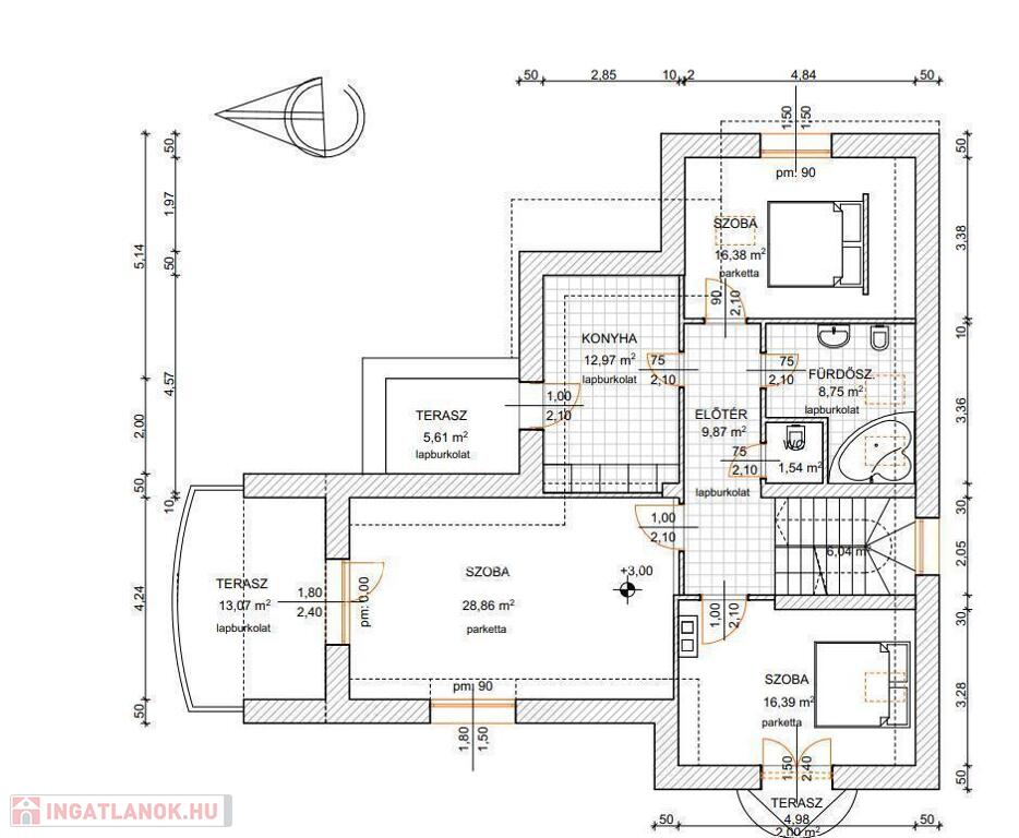 - Tágas terek: Az ingatlan tervezésekor a tágas terek kiemelt szerepet kaptak. Az első lakószinten a nappali, étkező és konyha területe egybefonódik, így kényelmes közösségi teret nyújt a család tagjai számára.