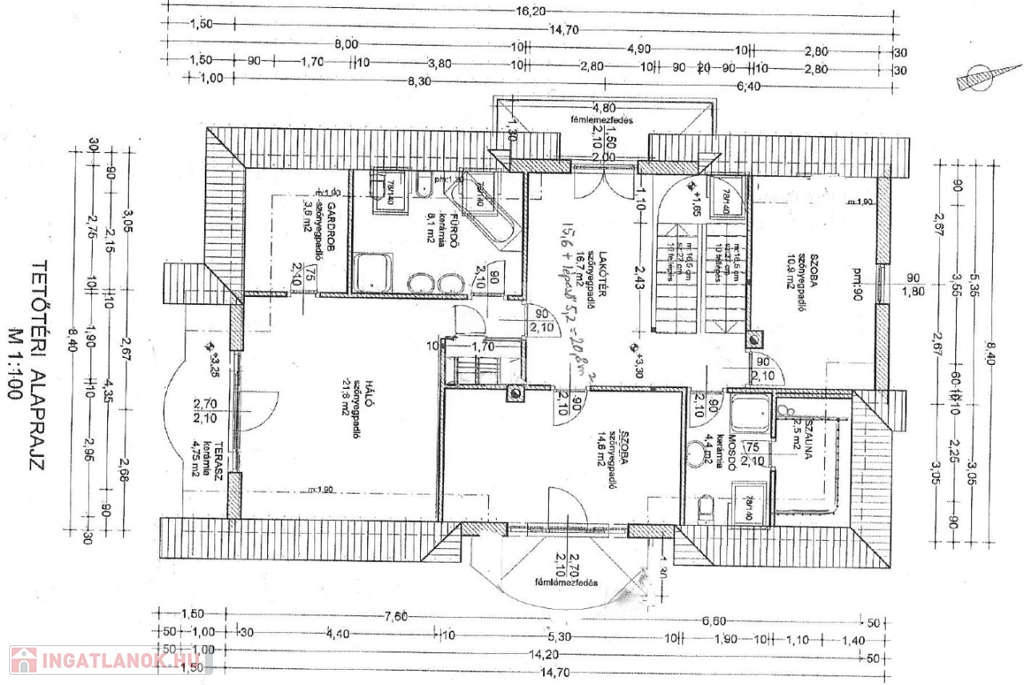 Hasznos nettó lakóterülete ( földszint 92,7 m² + tetőtér 88,4 m² ) összesen: 181,1 m².
