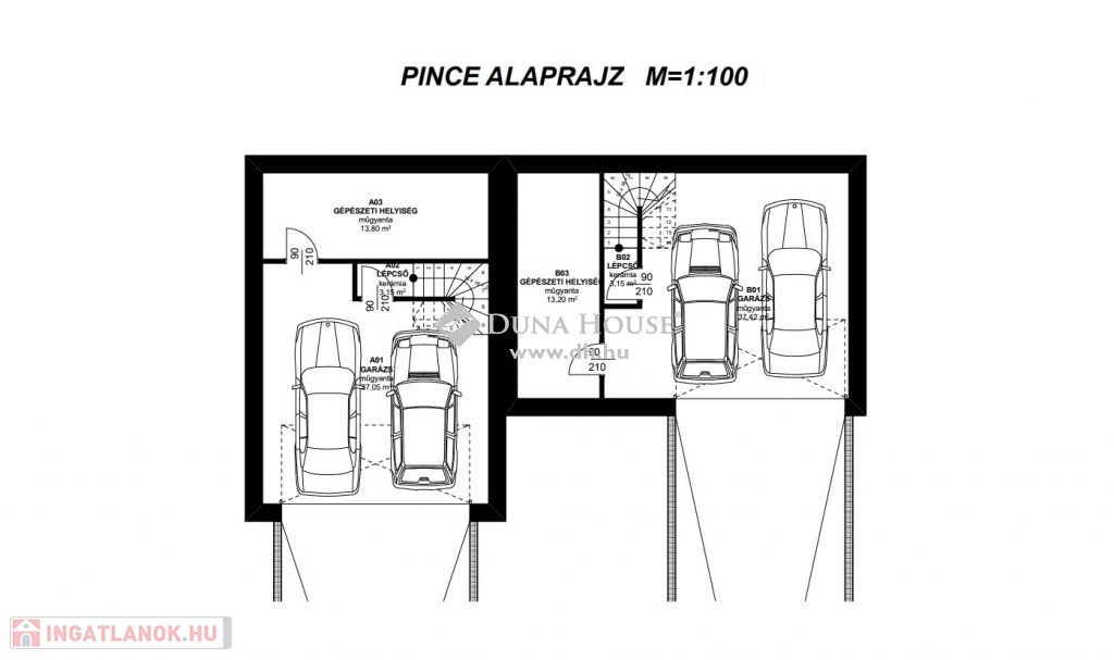 A lakótér alá egy további, alagsori szint került megtervezésre, mely két állásos garázsnak, továbbá egy háztartási, gépészeti helyiségnek biztosít helyet, többek között mosókonyhának, tárolónak is remekül hasznosítható.
