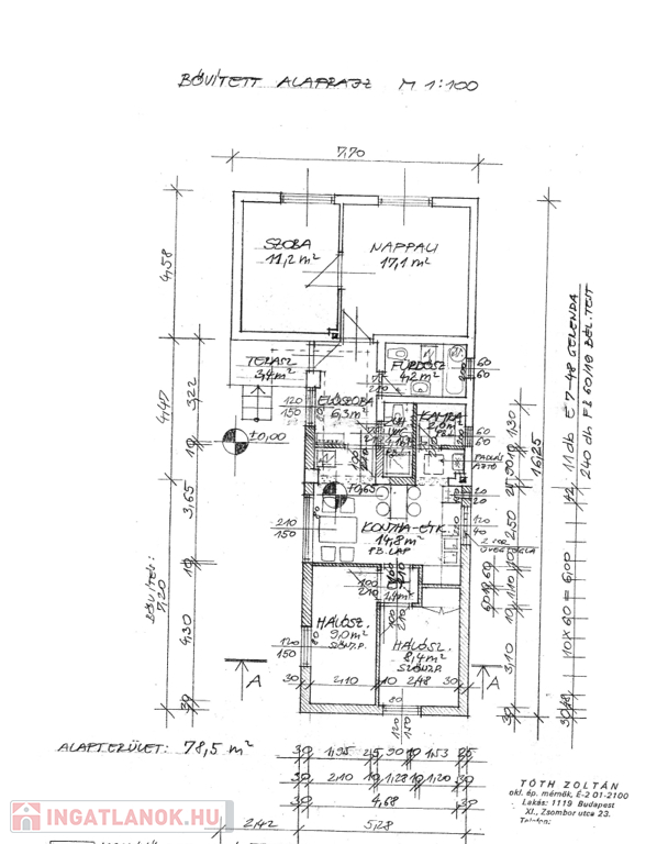 -előszoba(6,4m2), fürdőszoba(4,2m2), WC+kézmosó(4,1m2), nappali(17,1m2), hálószoba(11,2m2), konyha+étkező(14,8m2), kamra(2,1m2), közlekedő(1,4m2), 2 szoba(8,4m2, 9m2).