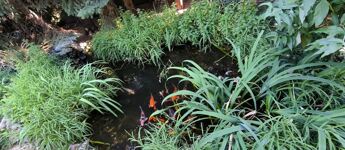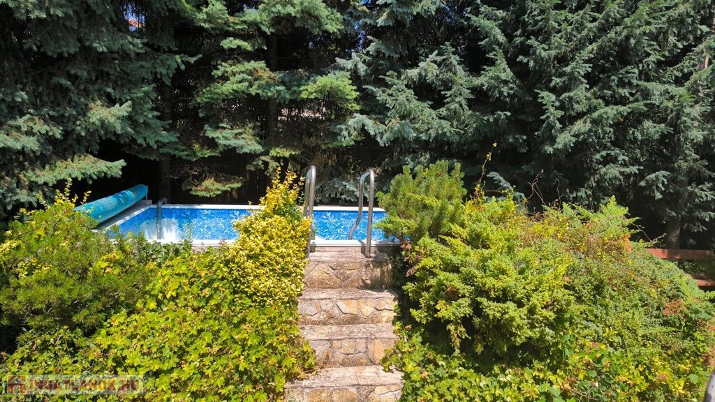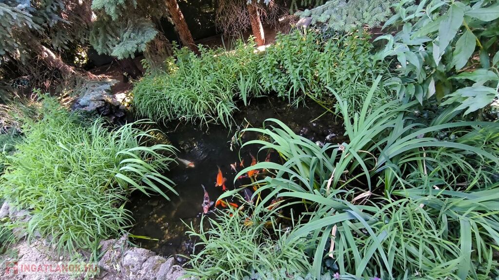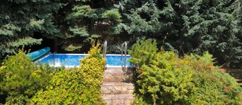 Intim, szeparált kert örökzöldekkel, kerti tóval és medencével