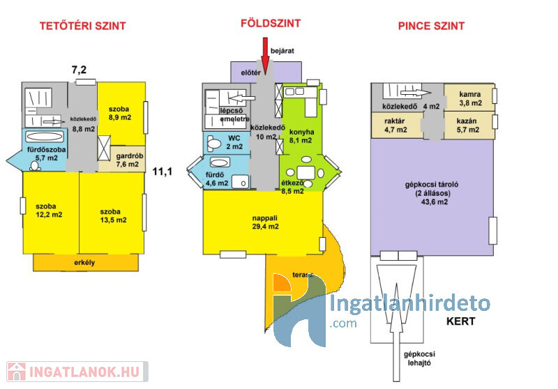 A TETŐTÉR szinten 3 szoba, gardróbszoba, fürdő és WC található.