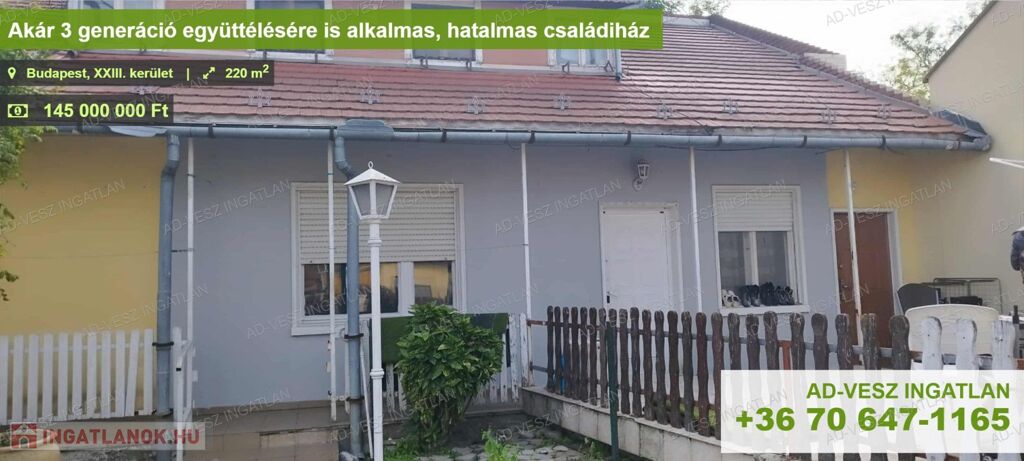 Budapest XXIII. kerületében, Soroksár csendes részén eladó egy vegyesfalazatú, (vályog, és tégla) 220m²-es családi ház, 440m²-es, két utcára nyíló saroktelken.