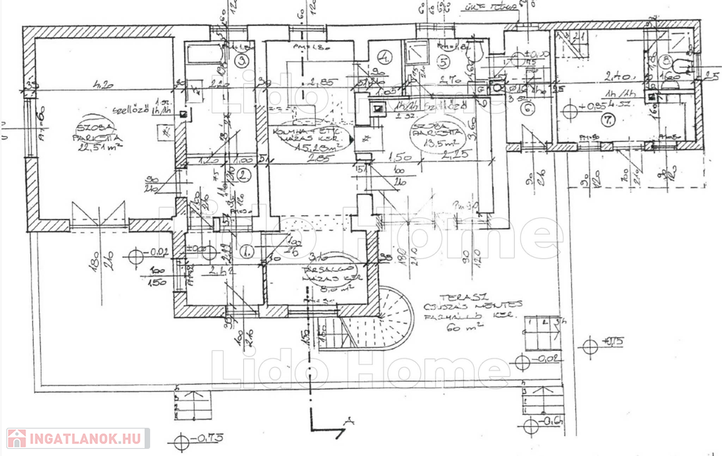 - HÁZ 1 - földszint helyiségei: terasz, nappali, előszoba, fürdőszoba káddal+ WC, konyha-étkező, kamra, hálószoba, fürdőszoba zuhanyzóval+ WC, fitnesz terem, pince előtér, külső kamra