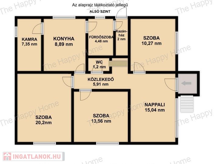 A tágas előkerttel rendelkező déli tájolású ingatlan ideális egy nagy család vagy több generáció számára, hiszen az alsó szintjén található egy nappali + 3 szoba, a konyha és egy tágas kamra, fürdőszoba + külön WC. A kazánház a lakásból, illetve kívülről is megközelíthető. A felső szinten jelenleg egy szoba található erkéllyel, de a tetőtér további része is beépíthető, így növelhető az alapterület.