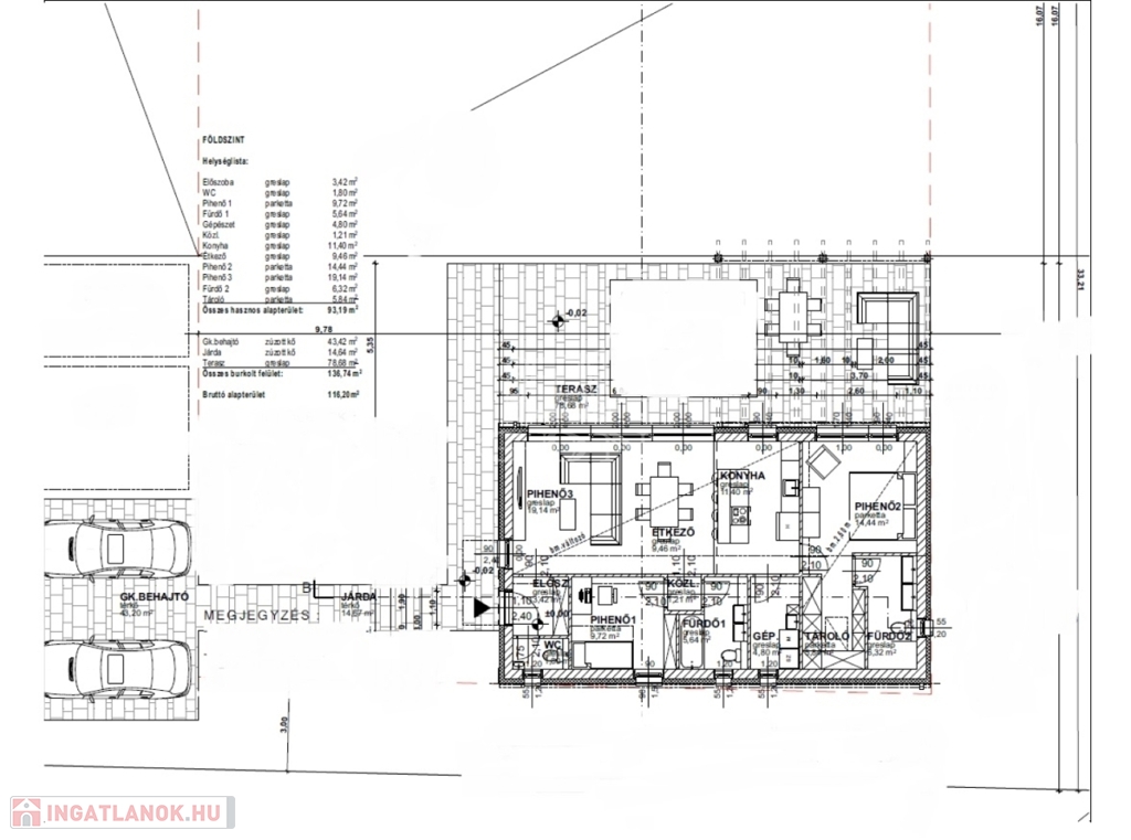 A 2025-ben épült ingatlan 93 négyzetméter hasznos alapterülettel rendelkezik, mely ideális elrendezést biztosít: egy körbe napozott amerikai konyha-nappali mellett két tágas hálószoba, két különálló fürdőszoba, előszoba és háztartási helyiség került kialakításra. A belső tér rugalmasan alakítható, így igény szerint akár nappali + 3 szobás elrendezés is megvalósítható. Az életteret jelentősen kiterjeszti a házhoz kapcsolódó 79 négyzetméteres terasz.