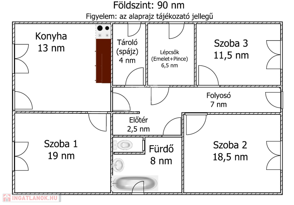 A földszint hasznos alapterülete 90nm, melyben található: