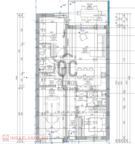 - Terasz és kert: nappaliból nyíló 6 m²-es terasz + 200 m² saját kert