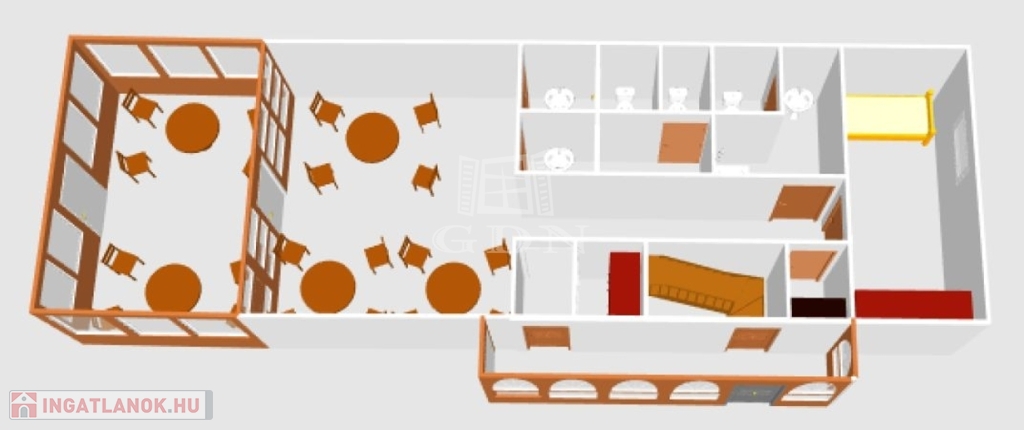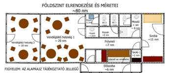 A földszinten található egy régóta működő vendéglátó egység, melyet további üzemeltetésre át lehet venni, de természetesen más jellegű vendéglátásra is átalakítható az épület.
